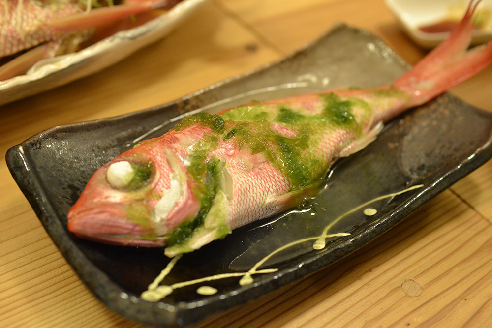 そしてアカマチのマース煮。マースとは沖縄の方言で 塩のことらしい。アオサがたっぷりのって、優しい塩味がとてもおいしい。